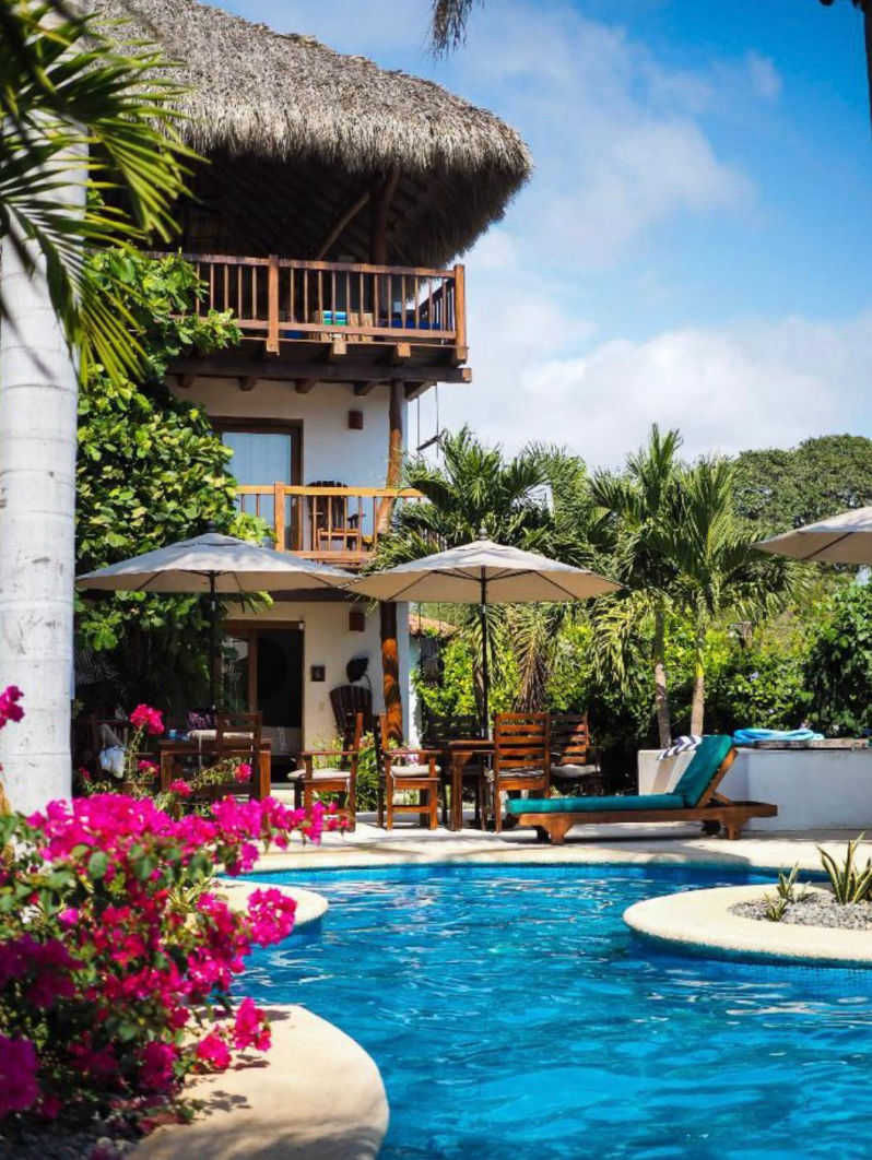 Outdoor Amenities: A well-maintained pool with sun loungers sits between the buildings and the ocean, surrounded by lush gardens and shaded areas that create a peaceful, tropical atmosphere.